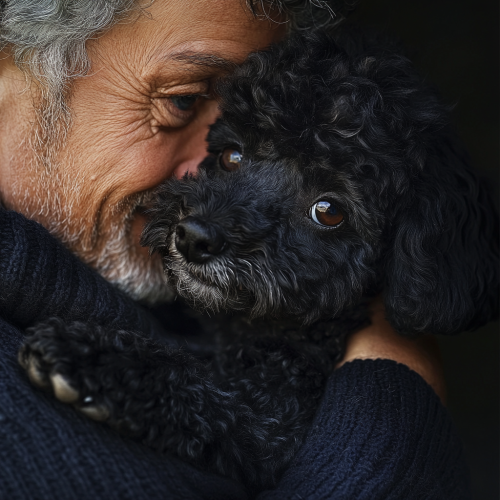 Small black poodle hyper-realistic high resolution, close-up photo 16:9 jumping into the arms of a man approximately 57 years old with gray hair, has a black Dacia Duster.