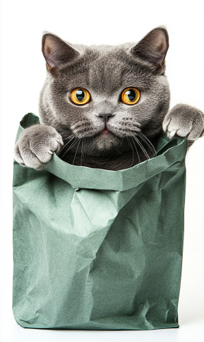 portrait photograph of a stocky british shorthair grey cat is posting like an actor, happy expression, isolated on white background --ar 3:5 --style raw