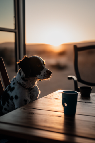 dog sitting on a chair at a table, sunset, window, coffee cups on the table, shallow-focus, 35mm, photorealistic, Canon EOS 5D Mark IV DSLR, f/5.6 aperture, 1/125 second shutter speed, ISO 100 --ar 2:3 --v 4