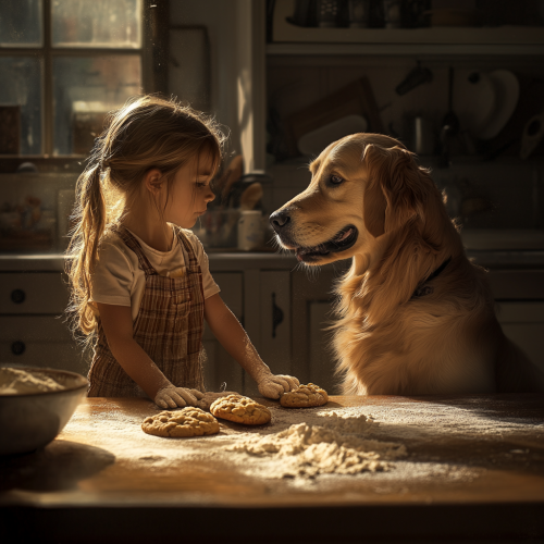 a hyper realistic photo of a small girl out in the house trying to make some cookies and her golden retriever dog is there waitng, kitchen is filled with spilled flour. on a cinematic lighting--ar4:5