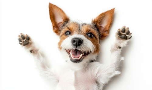 top view photograph of an adult jack russell dog was lying on his back on the floor, happy expression, isolated on white background --ar 5:3 --style raw