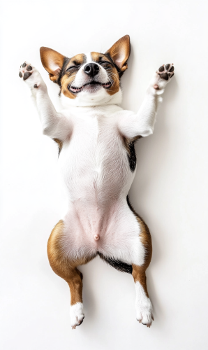 top view photograph of an adult jack russell dog was lying on his back on the floor, happy expression, isolated on white background --ar 3:5 --style raw