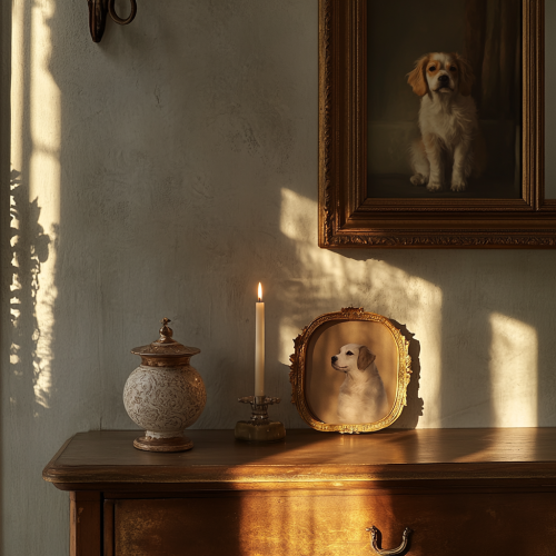 a home altar for a deceased pet, minimalistic interior, beige tones, a small urn and a candle in front of a pet portrait framed picture; –v 5 –ar 4:5 –style photorealistic –mood peaceful and cinematic –lighting soft and warm
