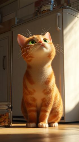 3D animated orange tabby cat sitting among scattered treats, green eyes big and innocent, fluffy tail wrapped neatly around paws, Pixar style animation, bright messy kitchen, angelic expression, subtle treat crumbs on whiskers while he is getting yelled at by his human owner --ar 9:16