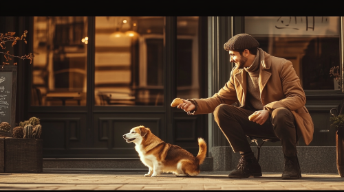 Medium shot of a friendly barista tossing a piece of bread to a stray dog outside a café, warm sunlight creating a cozy ambiance, expressions of kindness and hope --ar 16:9 --sref 2035722645 --s 200 --style raw --seed 45318771