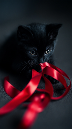 Photorealistic image of black kittens playing with a red ribbon in a dark room. Low-key photography style, with dramatic lighting creating deep shadows that highlight the cat’s sleek fur and mysterious expression. Shot with a 50mm lens, f/1.8 aperture for a shallow depth of field, ISO 200, capturing the rich details of the cat’s fur while softly blurring the background. The scene evokes an aura of elegance and mystique. --ar 9:16