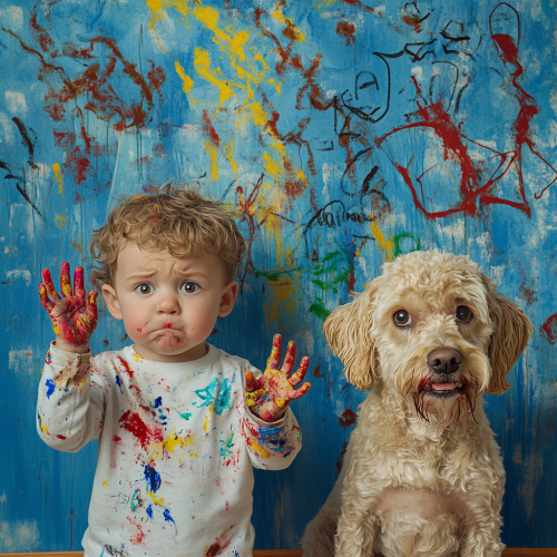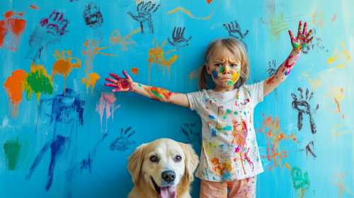 child and dog covered in finger paint with children's drawing all over the blue wall, camera is from above three quarter, child is frowning at the camera holding up fingers standing in front of the wall, terrified dog is looking at child, photorealistic --ar 16:9