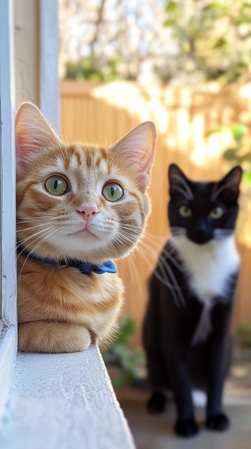 Whiskers, a small, fluffy orange tabby cat with bright green eyes and a tiny blue bow, lounges on a sunlit windowsill, gazing outside with a curious expression. Outside, Mittens, a sleek black-and-white cat with gentle, shy eyes, cautiously explores the yard, looking around with a hint of nervousness. The camera angle is from inside, showing Whiskers’ intent gaze and Mittens’ timid stance in a colorful, inviting yard. Bright, warm sunlight illuminates the scene. --ar 9:16