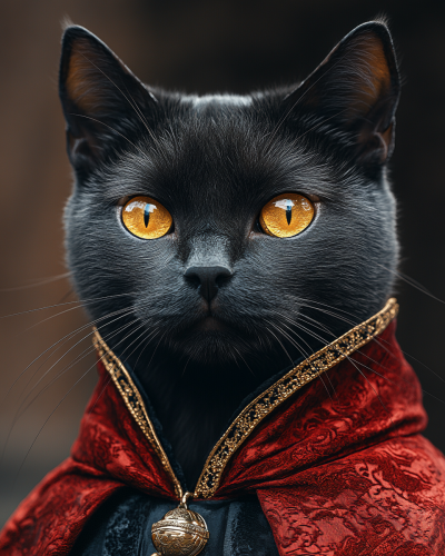 Ultra-realistic portrait, in the style of the art of Umberto Boccioni, a black cat with yellow eyes, the cat is dressed in red and black silk with a spooky vampire costume with gold details in the style of a Halloween costume monster photo shoot, portrait photography, high definition, detailed, 8k, high quality, great detail, photographic, photogenic, perfect, inside a room with background elements blurred in dark colors. --ar 4:5 --v 6.1 --stylize 1000
