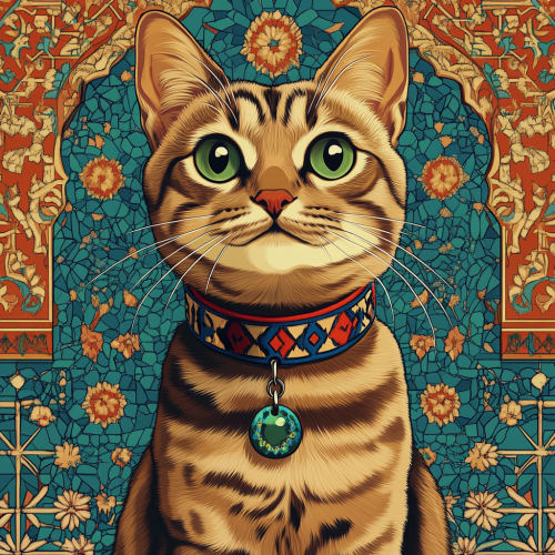 Create a 1080x1080 advertising poster featuring different styles of Moroccan cat collars displayed on a stylish table. The collars should showcase a variety of traditional Moroccan patterns and vibrant colors, such as reds, blues, and greens. The table should have an elegant surface, possibly adorned with Moroccan tiles or a textured fabric. Ensure the focus is on the collars, highlighting their unique designs and craftsmanship. Aim for a visually appealing layout that captures the essence of Moroccan culture and attracts cat lovers.
