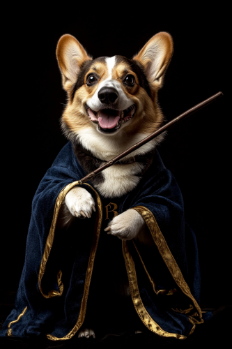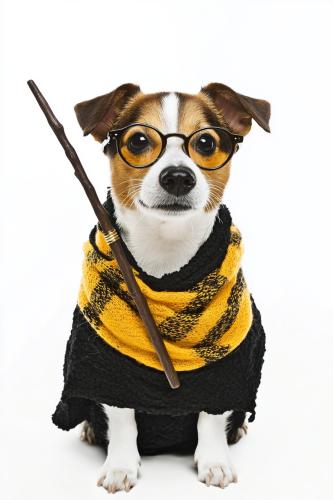 portrait photograph of an adult jack russell dog with hufflepuff stundent costume, he is wearing old glasses and casting spell with his wand, harry potter movie mood, serious expression, isolated on white background --ar 2:3 --style raw