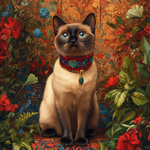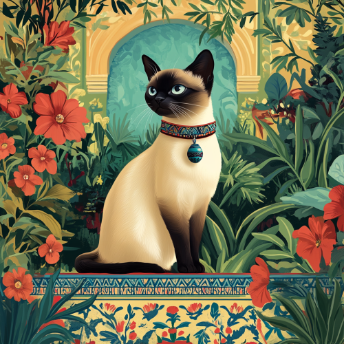 Create a 1080x1080 advertising poster featuring a Siamese cat wearing a Moroccan-style collar in a beautiful garden setting. The collar should be prominently displayed, showcasing traditional Moroccan patterns and vibrant colors like reds, blues, and greens. The garden should be lush and inviting, with flowers and greenery that enhance the overall aesthetic. Include text that highlights the collar's unique features, such as comfort, style, and Moroccan craftsmanship. Aim for a playful yet elegant design that appeals to cat lovers.