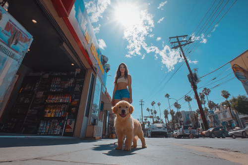 Wide-angle photo of a woman standing next to a dog outside a store, with a blue sky and a Los Angeles street scene in the background. The dog appears to be a golden retriever puppy, and the image captures a sunny summer day. The photograph was shot on a Canon EOS R5 at F2 and ISO400, resulting in a photorealistic image. This image is from the Unsplash stock photo library, and it serves as an establishing wide-angle shot. --ar 3:2