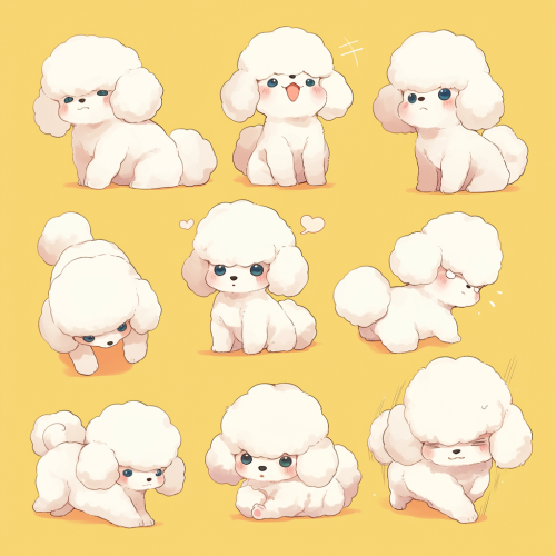 9 divisions, background white, full body,Dot eyes, Various poses, Various movements and actions,facial expressions (joy, anger, sadness, and humor),Simple design, simplicity, Toy Poodle --niji 6