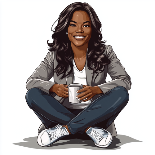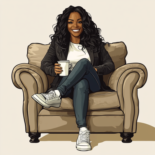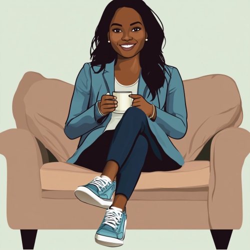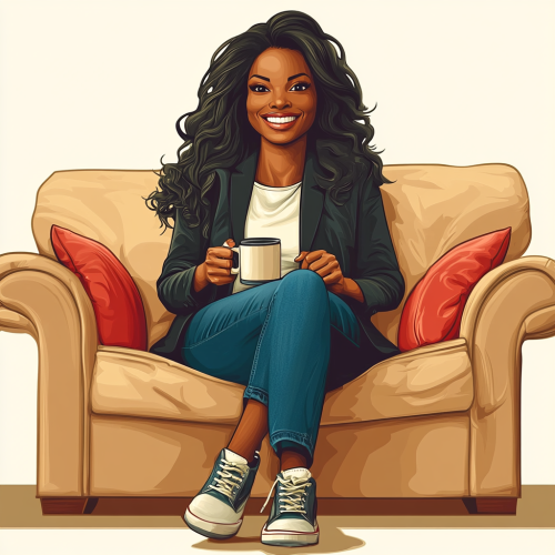 vector art of a black, female politician, she is sitting cross-legged on the couch in sneakers, holding a mug of coffee, she is wearing business suit jacket and jeans and smiling at camera --v 6.1