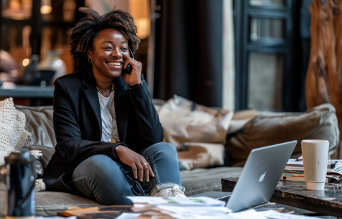 a black, female politician is sitting on the couch in sneakers, talking to someone across from her with coffee and papers on table next to laptop computer, she is wearing business suit jacket and jeans and smiling at camera while making phone call, black background, photo taken by Sony A7S III f/24 close up shot + lightroom gallery + behance photography unsplash ,8k --ar 64:41 --v 6.0