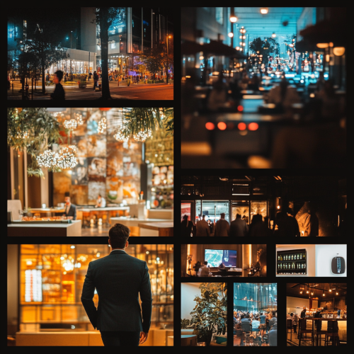 a collage of images representing different niches, including a luxurious Airbnb interior, a thrilling sports event, a bustling restaurant, and a political campaign rally, with a vibrant and diverse style, cinematic photo. 35mm photograph, film, bokeh, professional, 4k, highly detailed