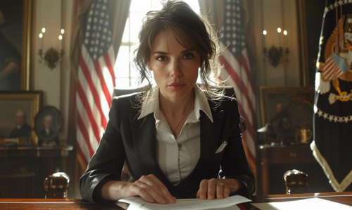 inside the Oval Office of the White, a female, short hair, suit, in charge, american flags in the background, sits at a desk, sinning a paper --ar 5:3 --s 750 --v 6.0