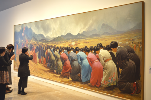 a gallery display of a very large socialist realism painting showing a group of Korean women on thier knees, bowing down to Kim Il Sung. --ar 3:2 --s 50