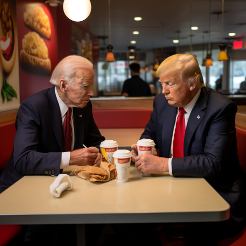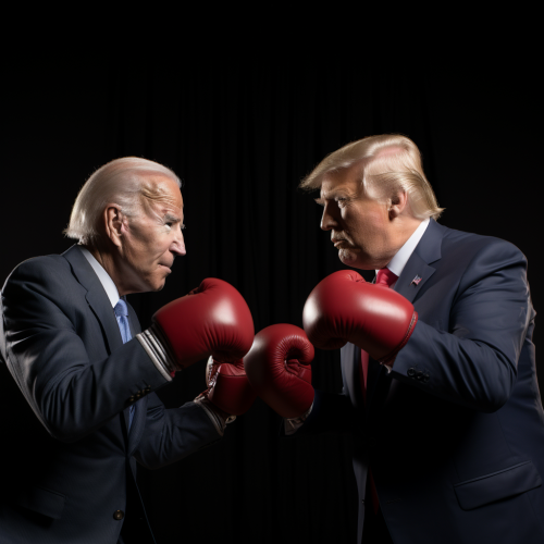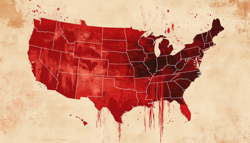 Depict a U.S. political map where every state is shaded in red. The background should have a subtle gradient with patriotic colors--soft reds, whites, and blues--to maintain a balanced yet impactful visual. Ensure both figures stand out while the red map is the centerpiece of the banner. --ar 7:4