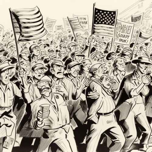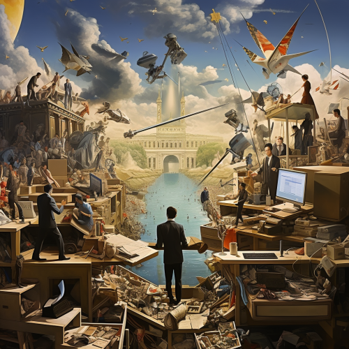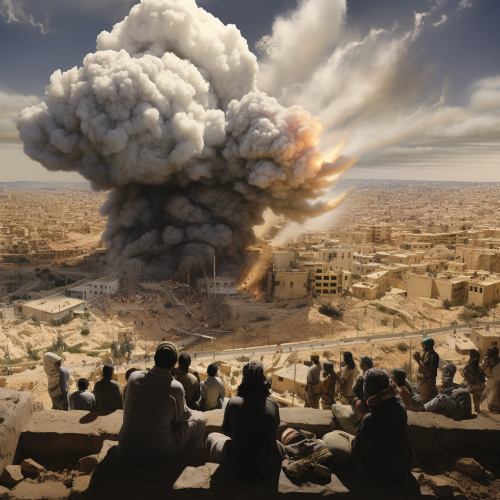 Raymond Pettibon's art is known for its stark black ink drawings often intertwined with text providing a narrative or commentary. This imagined artwork adopts his signature style while delving into the complex and ongoing Arab-Israeli conflict. Picture a large canvas, approximately 6 feet in height and 4 feet in width. The dominant feature is a colossal wave, drawn in Pettibon's typical wavy line style, its crest threatening to crash down. This wave is not just a physical entity, but a metaphorical representation of the tumultuous Arab-Israeli relations. The wave is illustrated with a fluid yet erratic line, embodying the unpredictable nature of the political tension. The crest of the wave morphs into the shapes of distorted faces representing the leaders and common people from both sides of the conflict, their expressions displaying a mix of fear, anger, and sorrow. Now, visualize the background, which is divided into two contrasting halves. The left side represents Israel, with iconography like the Star of David, a kippah, and images of historical figures like Golda Meir and Yitzhak Rabin. The right side represents the Arab nations with symbols like the crescent moon and star, a keffiyeh, and images of historical figures like Yasser Arafat and King Hussein of Jordan. The division in the background accentuates the dichotomy between the two factions while the menacing wave symbolizes the overhanging threat of conflict that affects both sides. In the foreground, beneath the wave, lies a barren land, void of life. This could symbolize the loss and devastation that has occurred over the decades due to the ongoing conflict. In the bottom right corner, in Pettibon’s characteristic textual annotation, the phrase, “The ceaseless tide of aspirations and despair,” is [...]