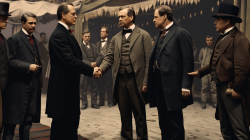 andrew johnson, president of the united states, shakes hands with some men, in the style of marsden hartley, post-world war i european classicism, grace cossington smith, photo taken with provia, political commentary, daniel garber, neo-concrete --ar 16:9 --v 5.2