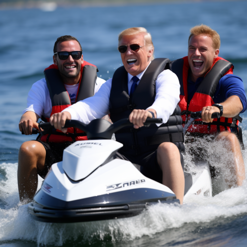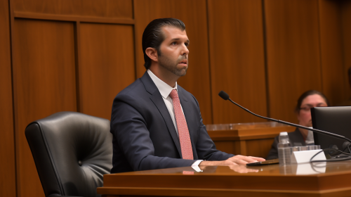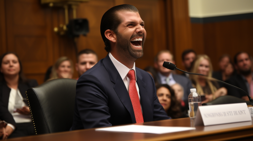 bearded donald trump jr. laughing and cracking jokes on the witness stand --ar 16:9