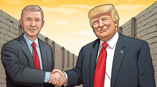 Biden and Trump smiling and shaking hands in front of the border wall in a cartoon style, --ar 16:9