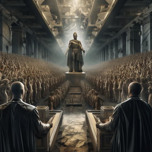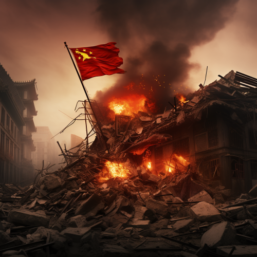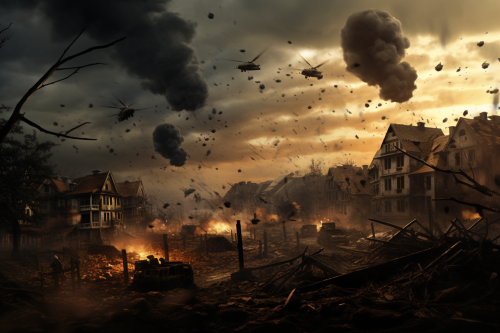 Desroyed Capitol in Washington 2024, The image is hyper-realistic, with every splash of water, every grimace of determination captured in stunning detail. The lighting is natural, diffused light over the scene. The colors are a mix of the warriors' earthy attire, the cool blues, The composition is a wide shot, capturing the breadth of the battle, with a particular focus on the Desroyed Capitol --ar 16:9 --s 50 --v 6.1