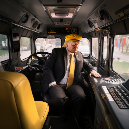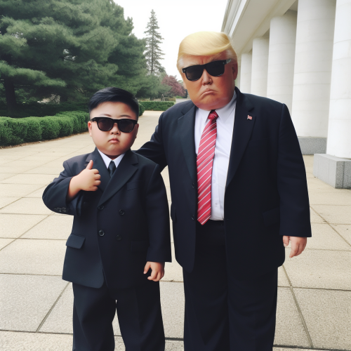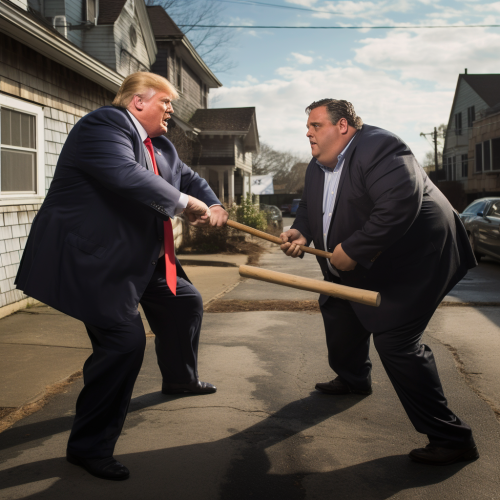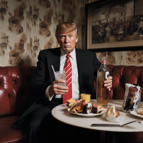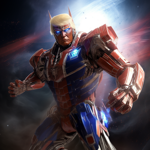 Donald Trump - Urban Maverick Distressed, black denim jeans with gold-embellished stitching. A tailored, black leather jacket with gold zippers. A white graphic tee with a bold, graffiti-style "45" (in reference to his presidency) design. Black combat boots with gold-plated accents. Aviator sunglasses and a black snapback cap with a gold "45" logo.