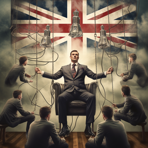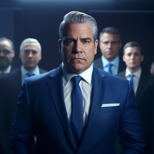 50 year old chubby man, grey slicked back hair, blue suit and a white tie, behind a nondescript campaign background, ultra realistic faces, 4K