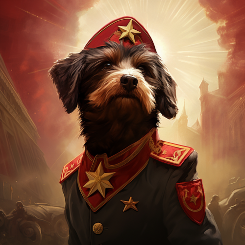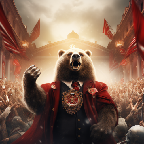 hyper realistic eye catching picture of a communist bear as a politician, in a suit, with a badge with an hammer and a sickle, above a crowd with soviet union flags, the atmosphere is epic --style raw