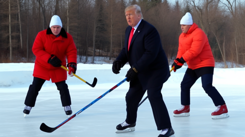Donald trump playing hockey with Putin, Emmanuel Macron and Kim Jong-un, realistic,cinematic--v 5.2 --style raw --aspect 16:9