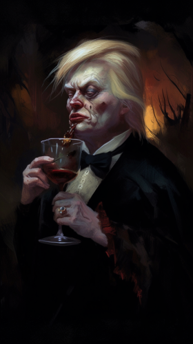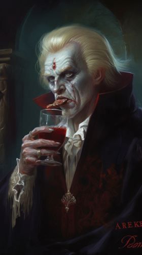 1980s dark fantasy book illustration Frazette-art style of Donald Trump as a Vampire drinking a glass of red wine - --ar 9:16 --v 5.0