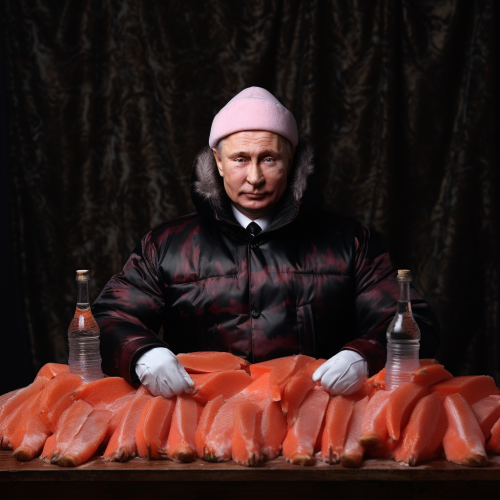jbject; died prezident Putin in the strong freeze , backstage : freezen food products like salmon