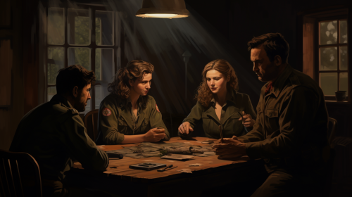 Germany in WW2, family gathered around a table, speaking in hushed tones and avoiding sensitive topics for fear of being overheard by informers --ar 16:9 --v 5.2
