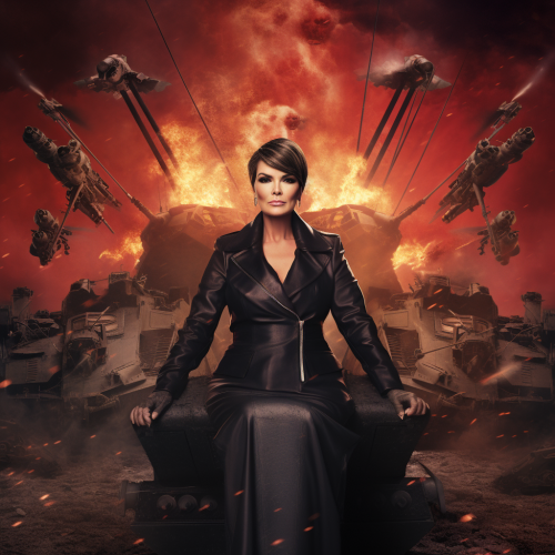 Kris Jenner as the President of the united states, with missiles and tanks behind her. Propoganda style image.