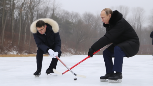 Emmanuel Macron playing hockey with Putin, Kim Jong-un, realistic, cinematic--v 5.2 --style raw --aspect 16:9