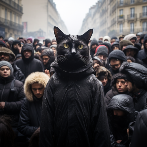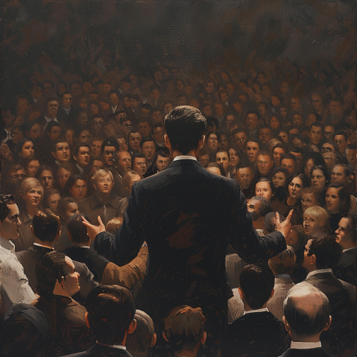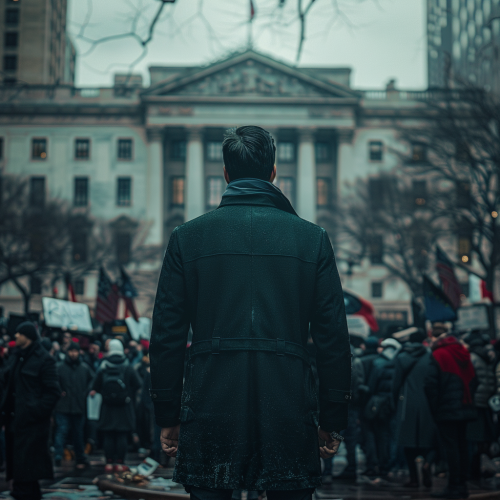 shot from behind of man in peacoat standing over a crowd of protestors in front of a white grand court house in Manhattan on a gloomy day, cinematic, 8k, hyper realistic