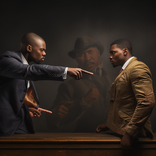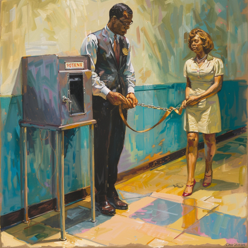a young black attorney leading a woman by a collar and a leash to a voting booth --v 6.0