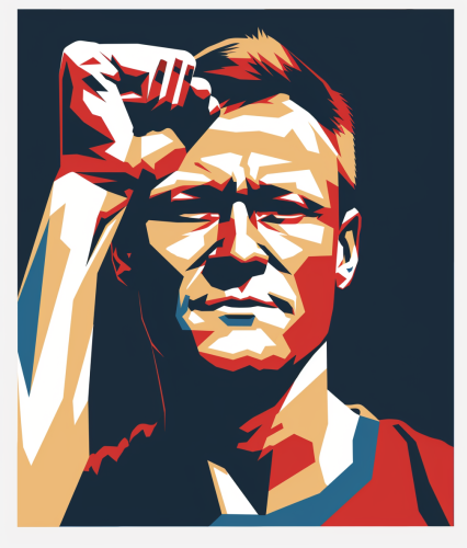 a portrait of Alexei Navalny, fist raised in protest, in the style of a Soviet propaganda poster, heavy emphasis on red, white, blue, and black, clean lines --ar 6:7 --v 6.0 --s 50 --style raw
