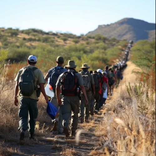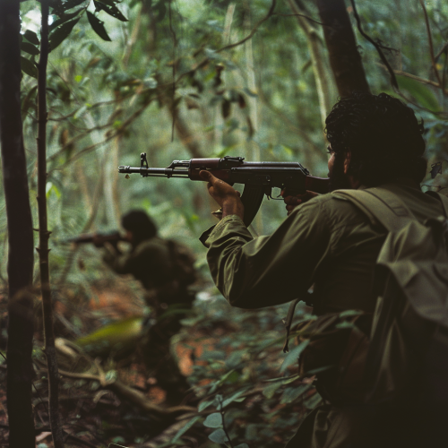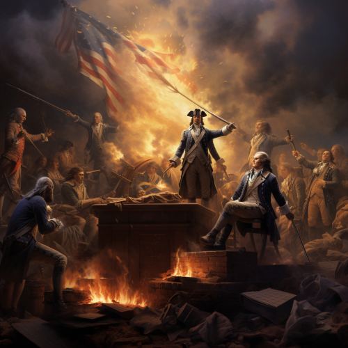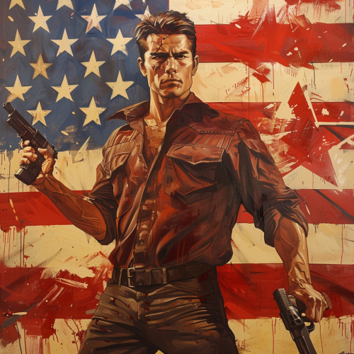 Man standing in front of an American flag while holding too many guns in the style of soviet propaganda mural