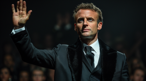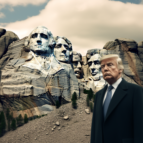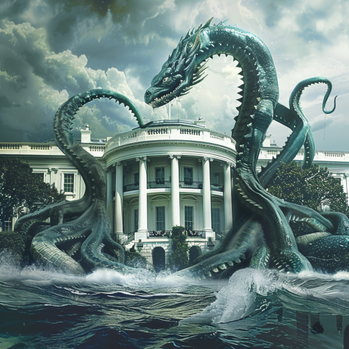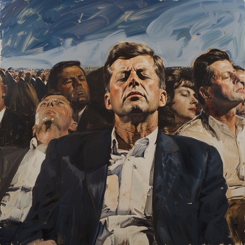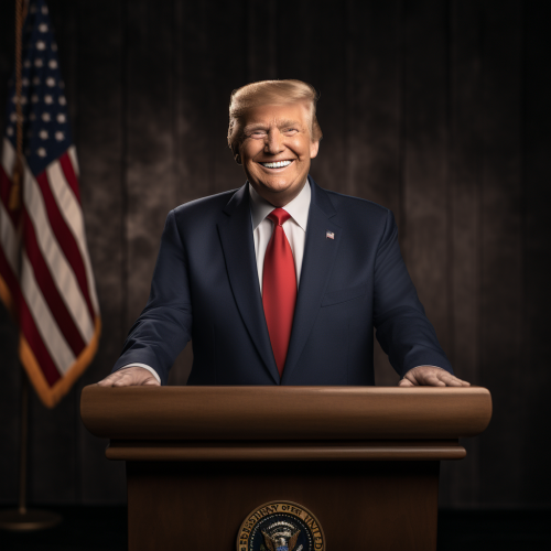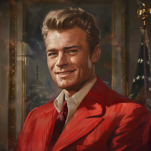 Craft a presidential portrait of James Dean, as if he had survived and became President of the United States. In this speculative portrayal, Dean is older, his timeless handsomeness matured with age. He is smiling warmly, exuding charisma and confidence. His hair is styled in a way that nods to his iconic look but adjusted for his age, impeccably groomed. He wears a striking red suit, a bold choice that signifies his unique path to the presidency and his enduring star quality. The background is elegant and stately, fitting for a president, with subtle symbols of American leadership and Dean's personal legacy interwoven into the setting. Created Using: sophisticated aging effects, vibrant yet dignified attire, presidential setting with a touch of Hollywood glamour, detailed textural realism, dynamic lighting to highlight his features, hd quality, natural look --ar 1:1 --v 6.0