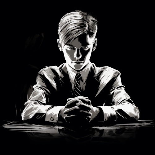 black background, boy imaginng himself as a corrupt politician, black and white sketch style