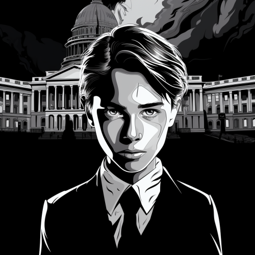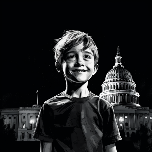 black background, Capitol in background, face of a young evil boy imaginng himself as a corrupt politician, black and white sketch style