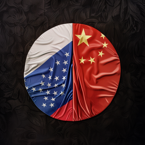 a chinese, russian and us flag symmetrically in a circle, each flag covering a third, photorealistic