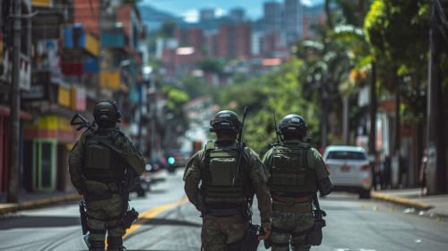 Streets lined with heavy police presence, armed forces, and checkpoints depict a city under tight control. The atmosphere is tense, and the presence of authority figures discourages any attempt at public dissent or gatherings. --ar 16:9 --v 6.0 --style raw