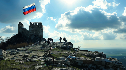 Daytime scene in the Crimean Peninsula on April 22, 2013, during a period of growing geopolitical tension. The foreground shows local citizens and tourists visiting historic sites, unaware of the looming political changes. In the background, Russian and Ukrainian flags flutter side by side under a partly cloudy sky, reflecting the complex and volatile atmosphere. The lighting is soft, with sunlight casting gentle shadows, capturing the calm before the storm in a region on the brink of conflict. --ar 16:9 --v 6.0 --style raw