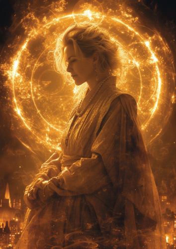 A pulchritudinous Divine Scintillating god or godess image with Margaret Thatcher, a divinities styles, and a Sepia-toned view --v 6.0 --c 15 --ar 5:7 --s 750