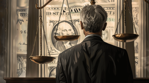 fed chair Jerome Powell standing in front of the giant dollar scale and pondering the placement of the weights --ar 16:9